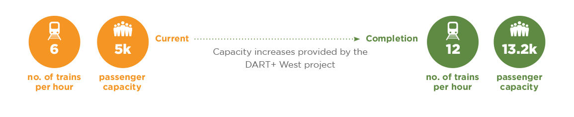 - Increase train capacity from the current 6 trains per hour per direction up to 12 trains per hour per direction subject to demand. Passenger capacity will increase from 5,000 in 2019 to 13,200 passengers