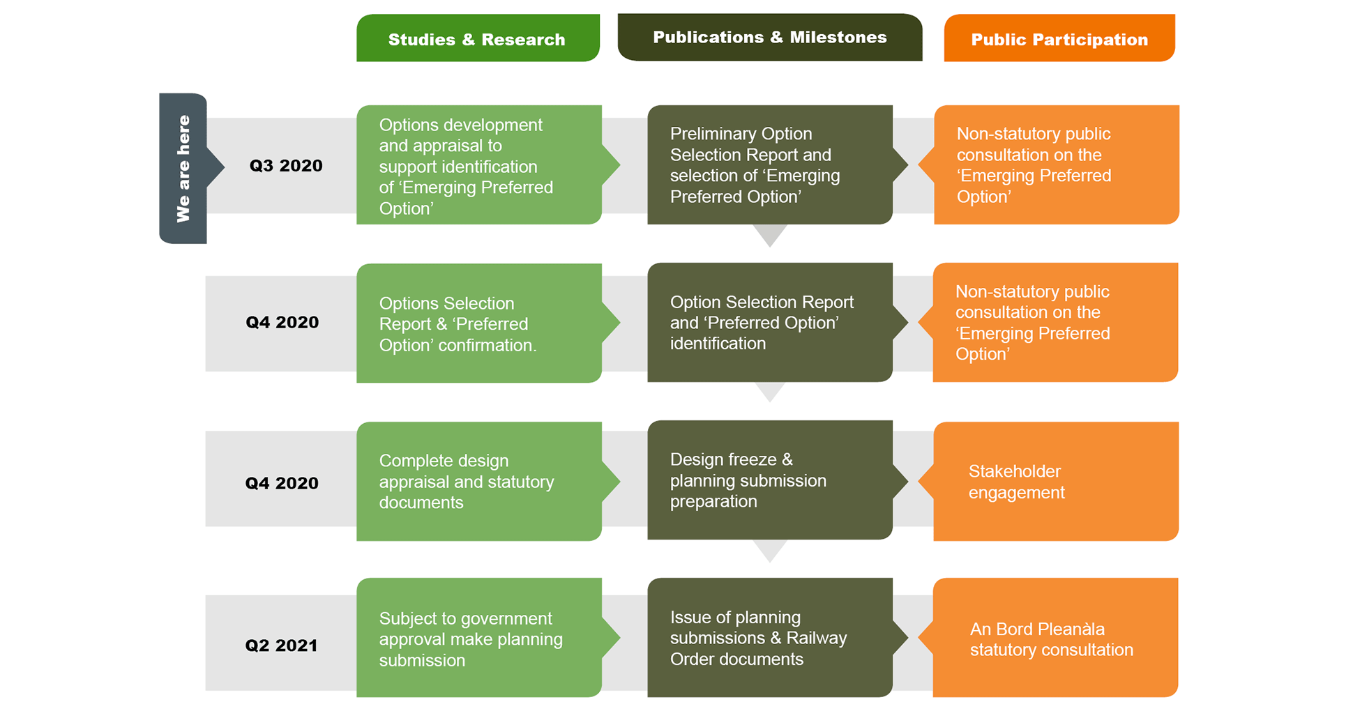 | Q2 2021 | Subject to government approval make planning submission | Issue of planning submissions and Railway Order documents | An Bord Pleanala statutory consultation |