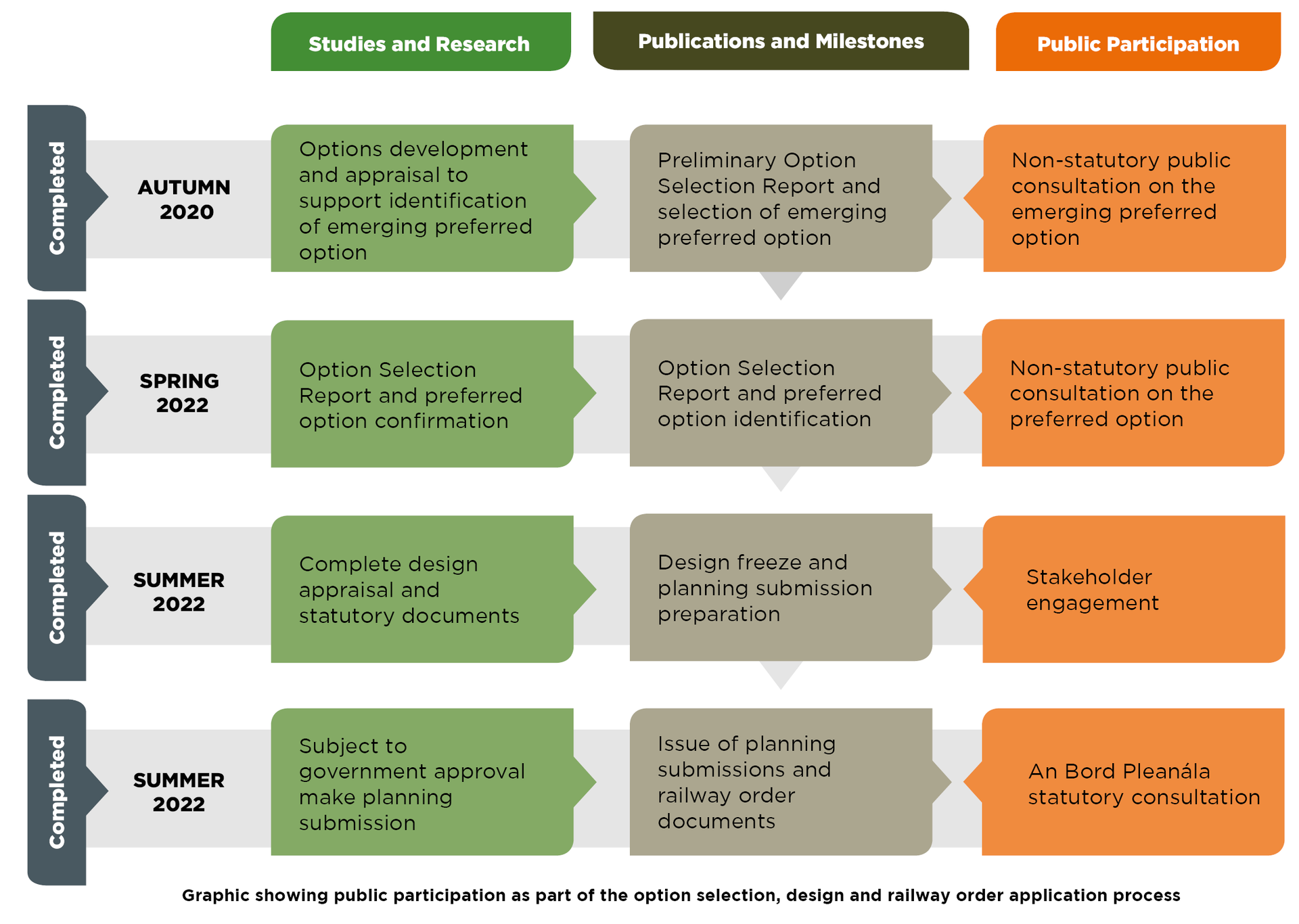 | Completed | Summer 2022 | Subject to government approval make planning submission | Issue of Planning submission and railway order documents | An Bord Pleanála statutory consultation |