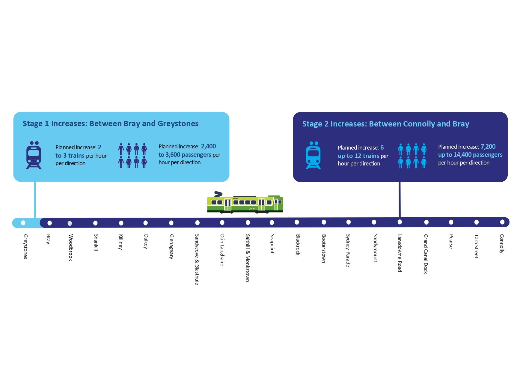 - Stage 2 of DART+ Coastal South will seek to deliver the infrastructure enhancements that will enable an increase in train frequency from 6 trains per hour to 12 trains per hour between Dublin Connolly and Bray (Daly) Stations.
